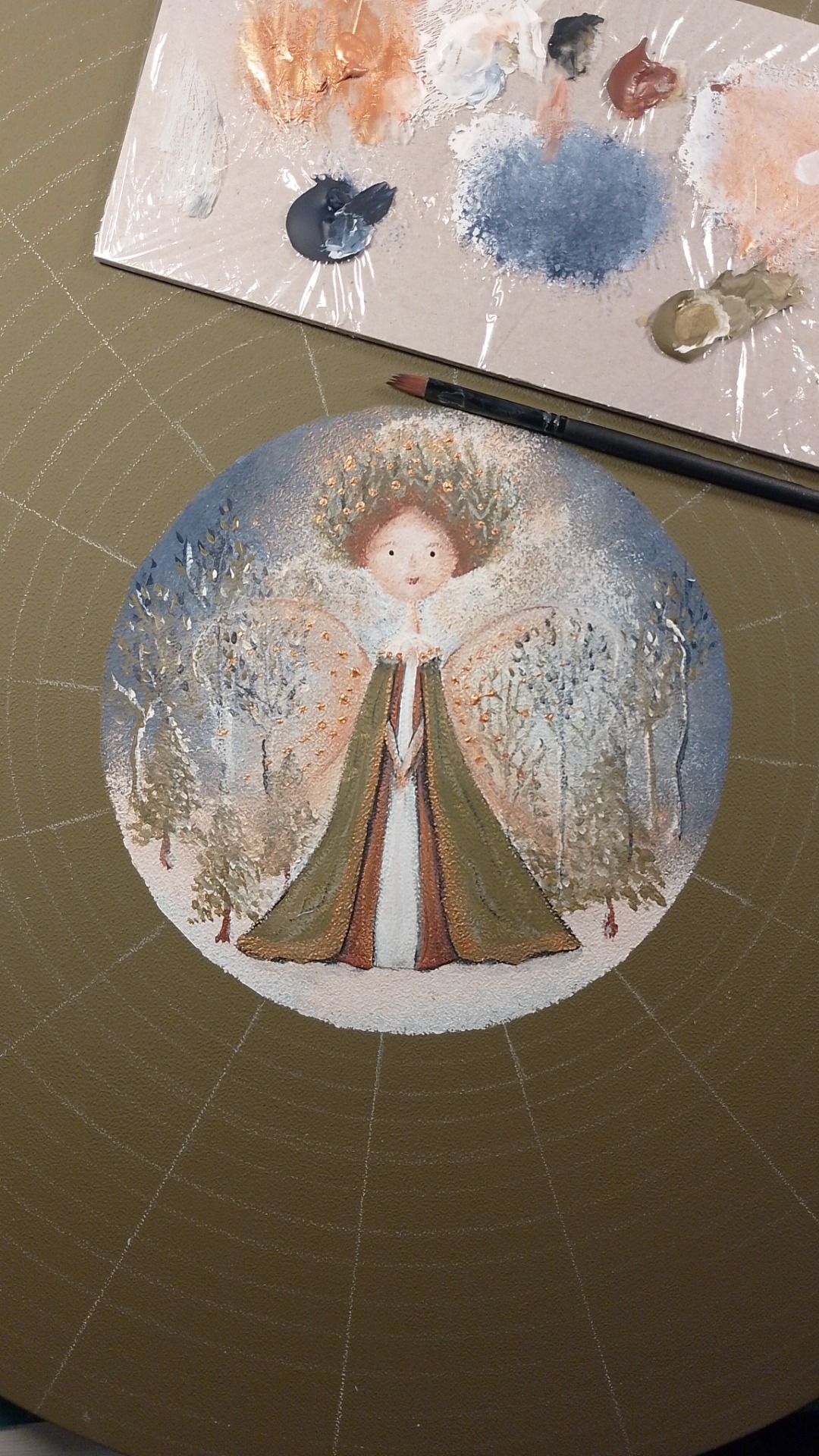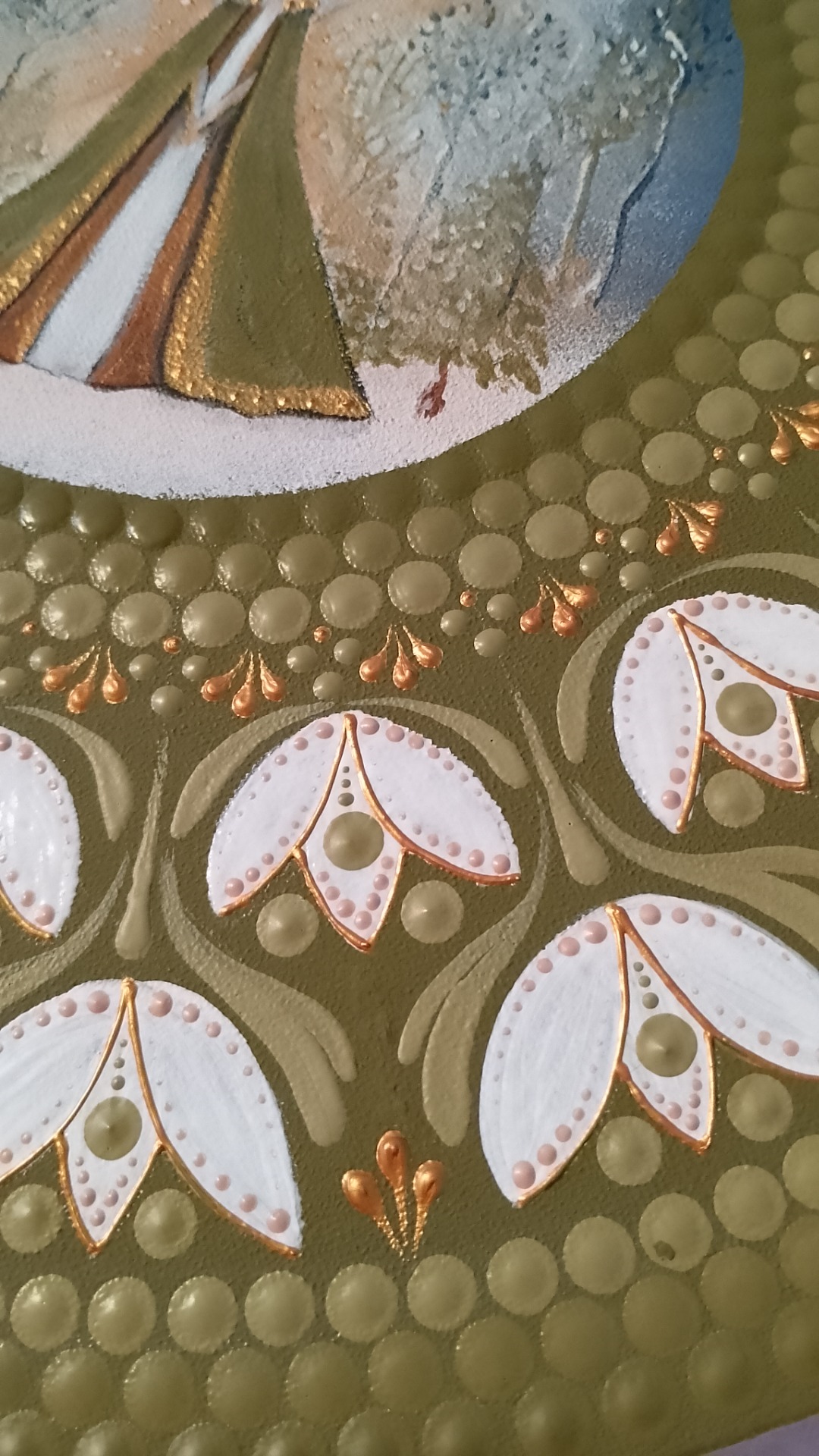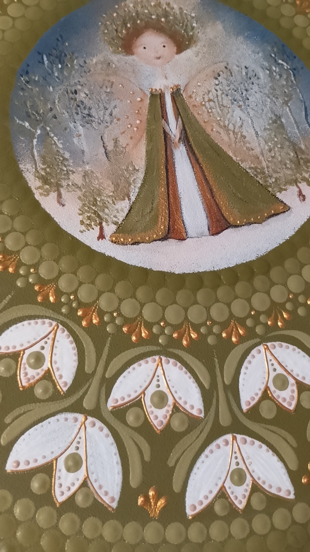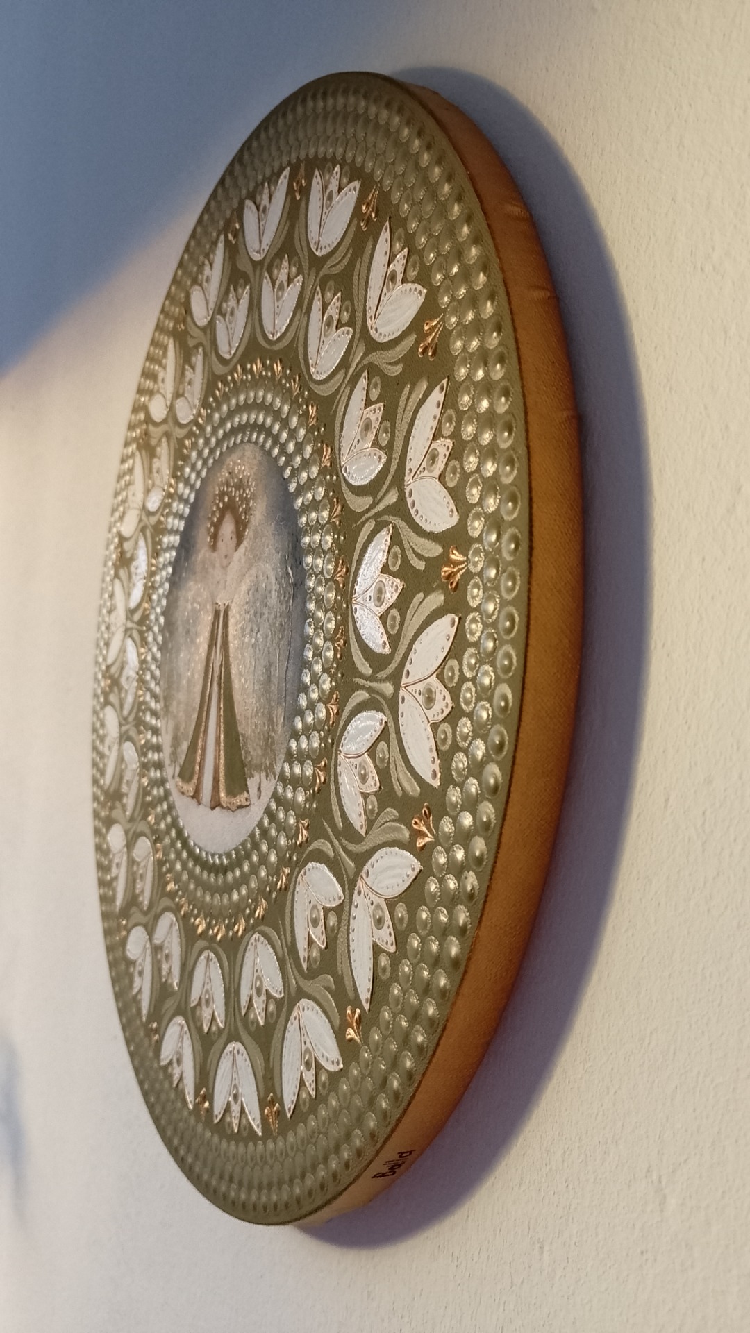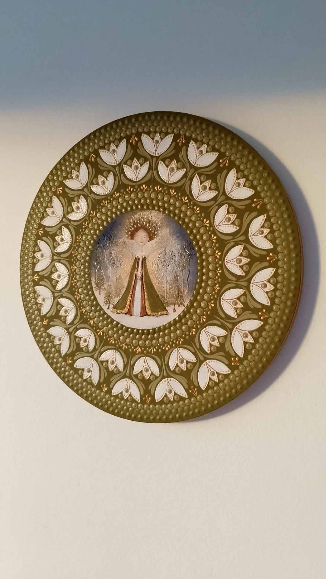 This painting is unique for its harmonious blend of folk-art ornamentation and a soft, spiritual central figure, creating a mandala-like sense of balance and calm. The intricate dot work, natural color palette, and delicate fairy imagery give it a timeless, handmade character that feels both meditative and deeply personal.